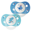 Duo de sucettes anatomiques +18 mois avec anneau associant téterelle anatomique et collerette Confort+ anti-rougeurs et irritations. Décors Hippopotame et Coq.
