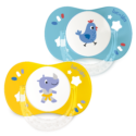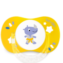 Duo de sucettes anatomiques 6-18 mois avec anneau associant téterelle anatomique et collerette Confort+ anti-rougeurs et irritations. Décors Rhinocéros et Coq.