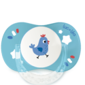 Notre duo de sucettes anatomiques 6-18 mois aux décor Rhinocéros et Coq est fabriquée en Europe (Allemagne), conforme à la norme européenne EN 1400.