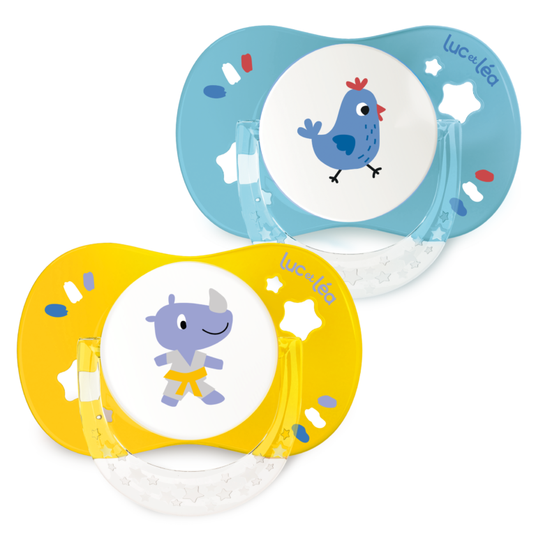 Luc et Léa a fait le choix de proposer des sucettes sans anneaux pour qu’elles soient plus légères dans la bouche de bébé.