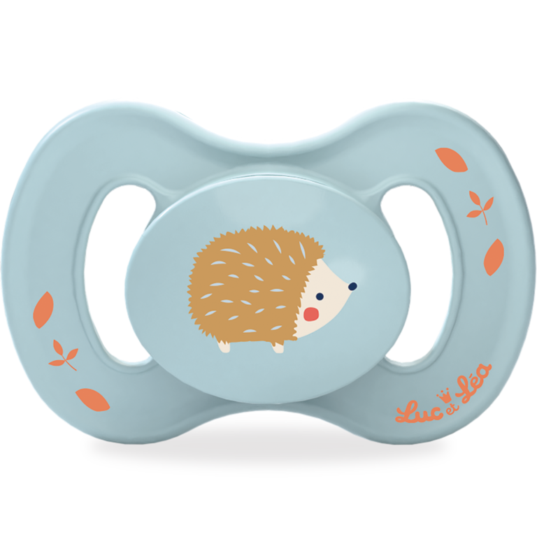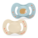 Duo de sucettes anatomiques extra-fine 0-6 mois de haute qualité associant téterelle extra-fine et collerette en plastique d'origine végétale. Sucettes médicalement recommandées par les dentistes et odontopédiatres de l'UFSBD (Union Française pour la Santé Bucco-Dentaire). Décor Hérisson.