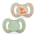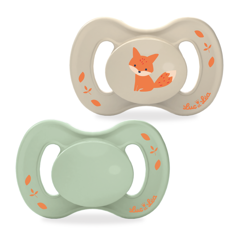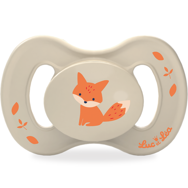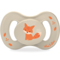 Duo de sucettes anatomiques extra-fine 6-18 mois de haute qualité associant téterelle extra-fine et collerette en plastique d'origine végétale. Sucettes médicalement recommandées par les dentistes et odontopédiatres de l'UFSBD (Union Française pour la Santé Bucco-Dentaire). Décor Renard.