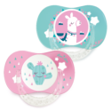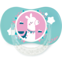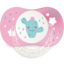 Duo de sucettes anatomiques 6-18 mois avec anneau associant téterelle anatomique et collerette Confort+ anti-rougeurs et irritations. Décors Lama et Cactus.