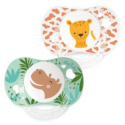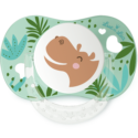 Duo de sucettes anatomiques 6-18 mois avec anneau associant téterelle anatomique et collerette Confort+ anti-rougeurs et irritations. Décors Léopard et Hippopotame.