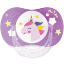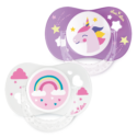 Duo de sucettes anatomiques +18 mois avec anneau associant téterelle anatomique et collerette Confort+ anti-rougeurs et irritations. Décors Licorne Arc en ciel.