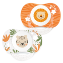 Duo de sucettes anatomiques +18 mois avec anneau associant téterelle anatomique et collerette Confort+ anti-rougeurs et irritations. Décors Lion et Panthère.