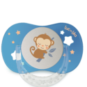 Duo de sucettes nuit anatomiques +18 mois avec anneau associant téterelle anatomique et collerette Confort+ anti-rougeurs et irritations. Décors Paresseux et Singe.