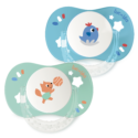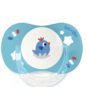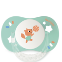Duo de sucettes physiologiques 0-6 mois avec anneau associant téterelle physiologique et collerette Confort+ anti-rougeurs et irritations. Décors Ecureuil et Coq.