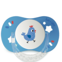 Notre duo de sucettes physiologiques 6-18 mois aux décors Élephant et Coq est fabriquée en Europe (Allemagne), conforme à la norme européenne EN 1400.