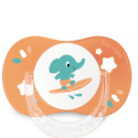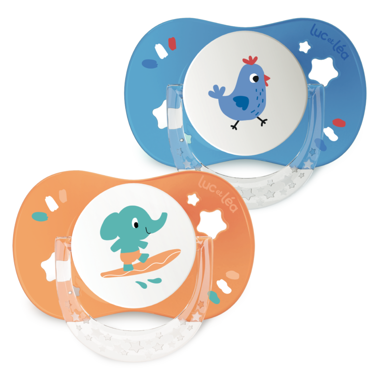 Idéale pour les bébés allaités ou en relais de l’allaitement, la forme de la téterelle physiologique s’adapte parfaitement au palais de bébé, tout en respectant le développement harmonieux de ses gencives et de ses dents. En silicone de grade médical, la téterelle physiologique est résistance, douce et souple, sans risque d’allergie pour l’enfant. Découvrez notre édition limitée de l’été « Les Minis Sportifs » aux décors sportif, des duos colorés, fun et mixtes pour accompagner bébé cet été. Avec les petits décors Élephant et Coq, vous serez plongés dans l’univers du surf.