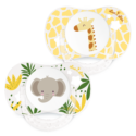 Duo de sucettes physiologiques 0-6 mois avec anneau associant téterelle physiologique et collerette Confort+ anti-rougeurs et irritations. Décors Eléphant et Girafe.