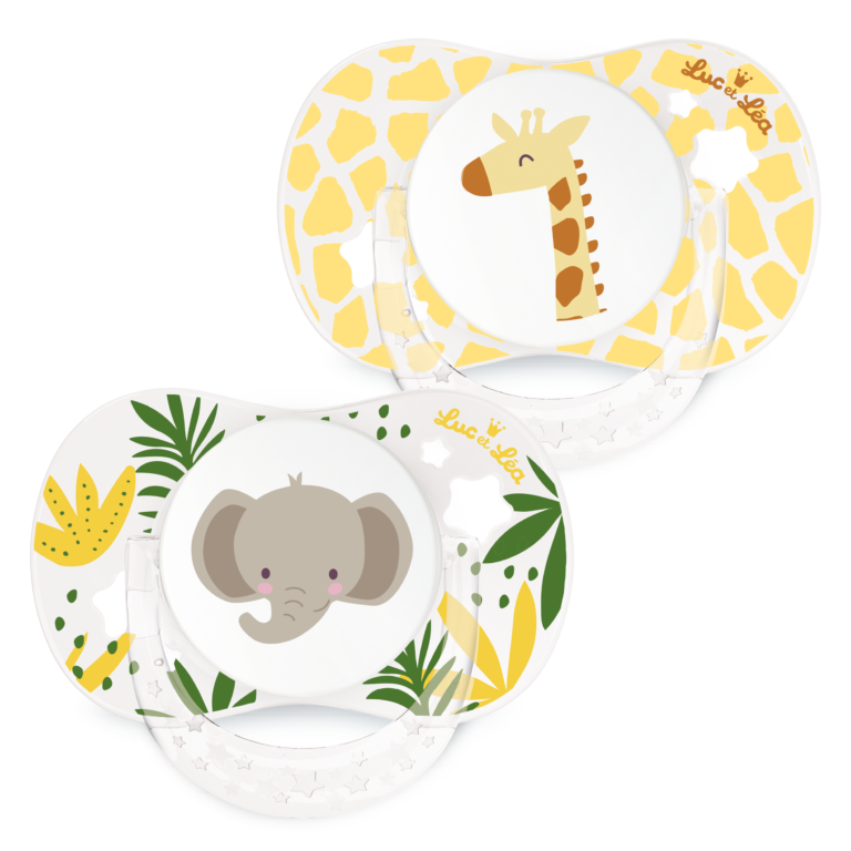Notre duo de sucettes 0-6 mois aux décors Eléphant et Girafe est fabriqué en Europe (Allemagne), notre duo de sucettes est conforme à la norme européenne EN 1400.