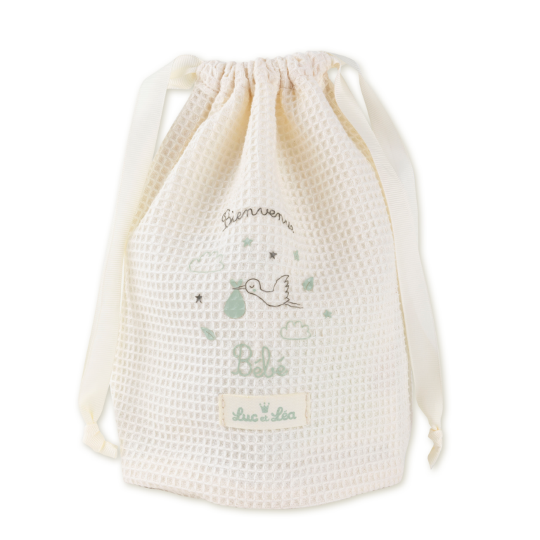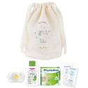 Cet assortiment est vendu dans une pochette en coton nid d’abeille que vous pouvez ensuite réutiliser : glissez-y tous les produits de bébé pour les week-ends ou les vacances !
