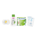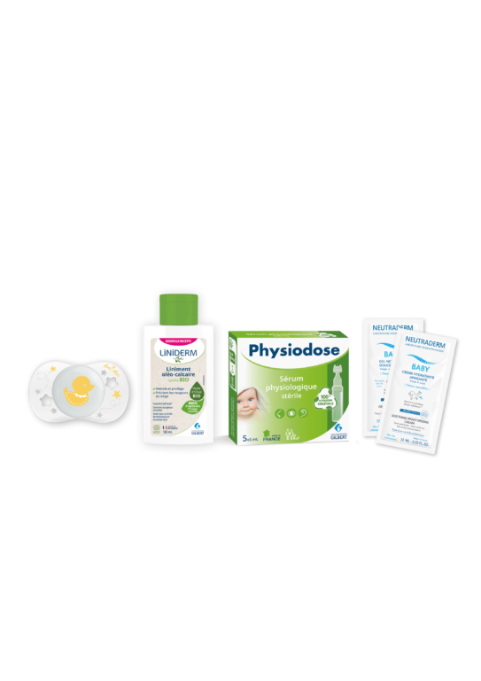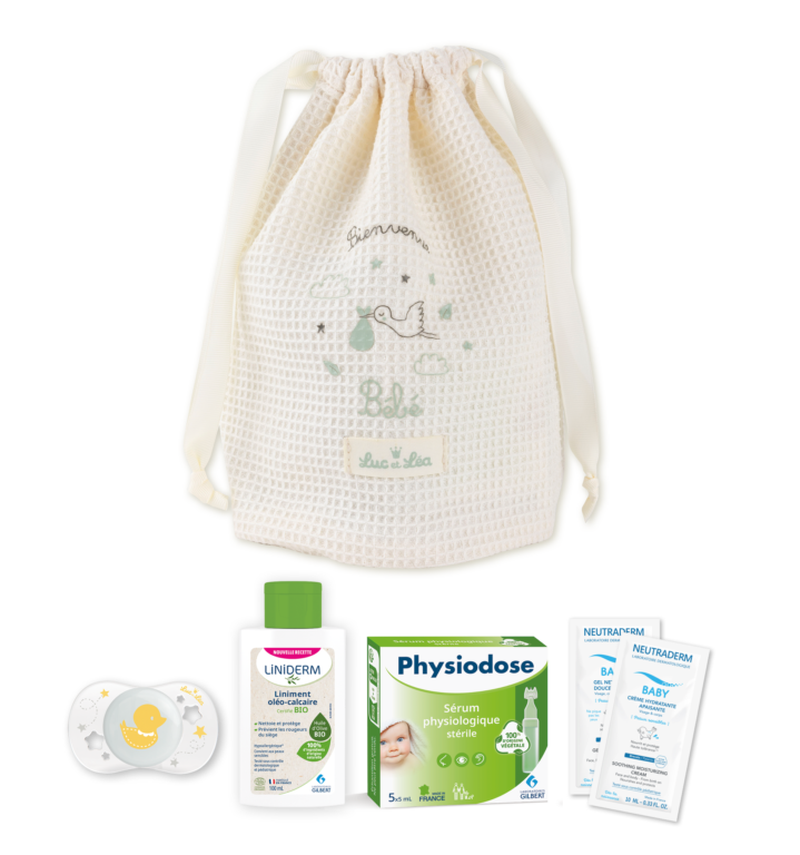 La pochette naissance Luc et Léa contient un assortiment de 5 produits pour le bain, la toilette, le change et le soin, nécessaires à l’arrivée à de bébé :