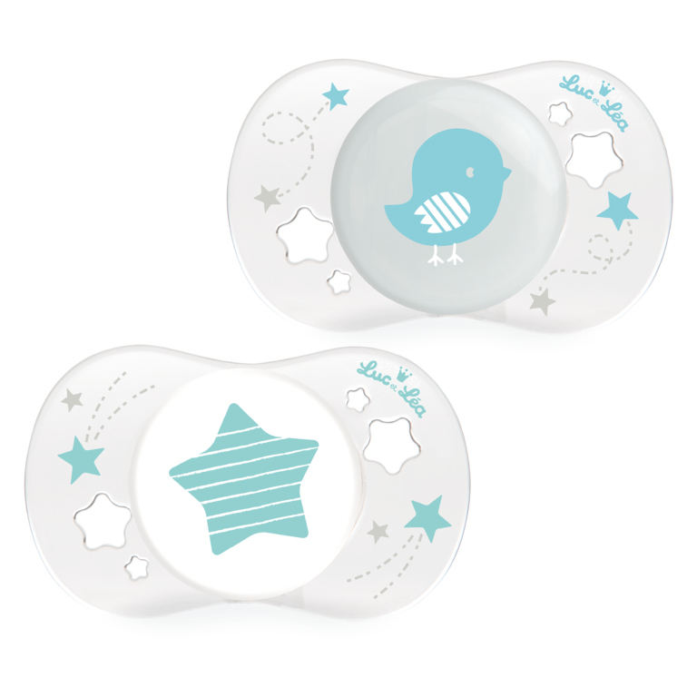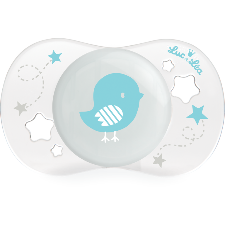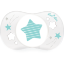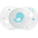 Sucette anatomique 0-2 mois avec une téterelle ultra-petite adaptée aux nouveau-nés et une collerette incurvée permettant d'éviter les rougeurs et les irritations autour de la bouche de bébé. Décor Étoile ou Oiseau.