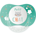 Sucette anatomique +18 mois avec anneau associant téterelle anatomique et collerette Confort+ anti-rougeurs et irritations. Décor Petit chat.