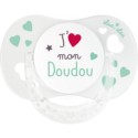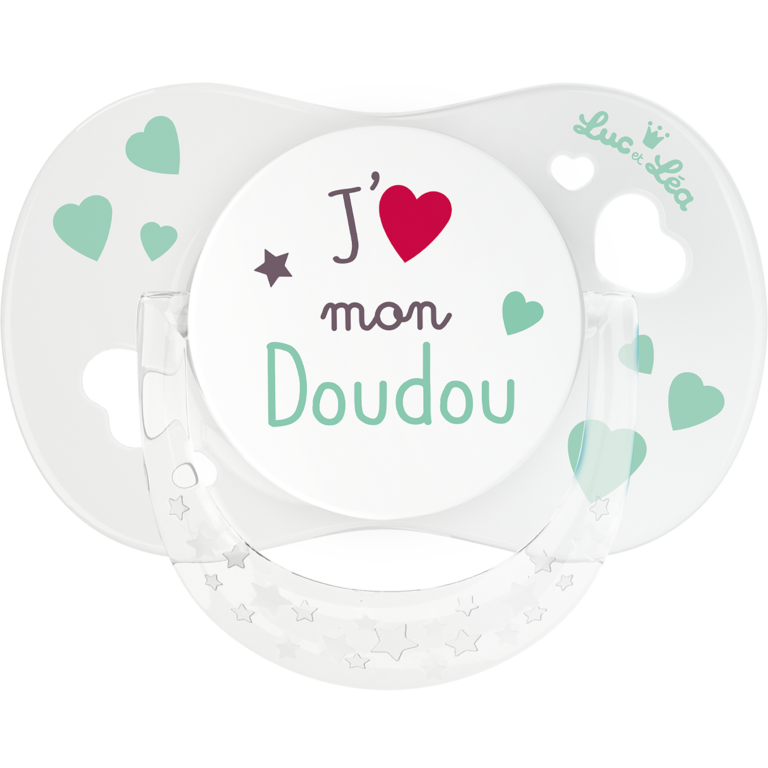 Sucette physiologique 0-6 mois avec anneau associant téterelle physiologique et collerette Confort+ anti-rougeurs et irritations. Décor J'aime mon doudou.