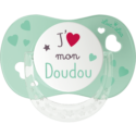 Sucette physiologique 6-18 mois avec anneau associant téterelle physiologique et collerette Confort+ anti-rougeurs et irritations. Décor J'aime mon doudou.